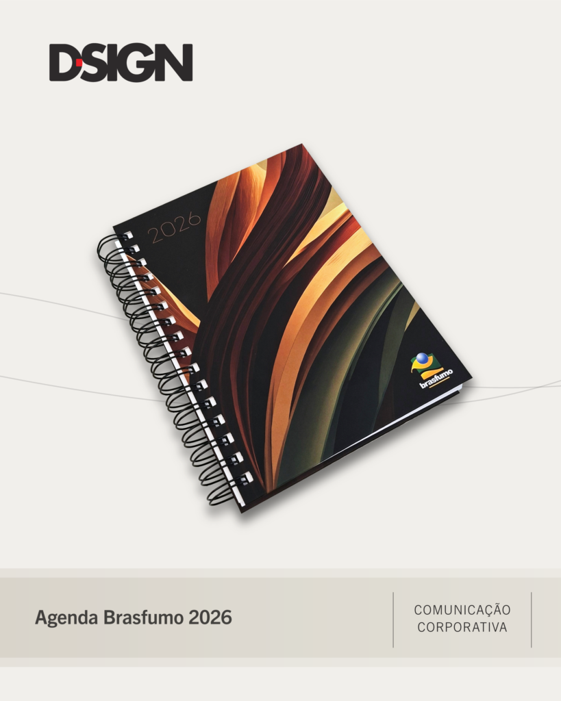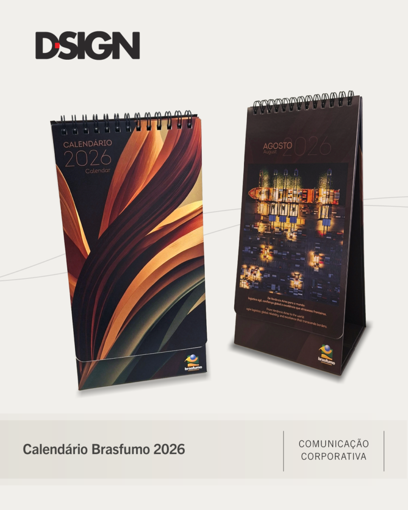 Os materiais institucionais vão além da organização do dia a dia: fortalecem a identidade da marca, alinham a comunicação e mantêm parceiros e colaboradores conectados aos valores da empresa. A agenda e o calendário 2026 da Brasfumo, nosso cliente de longa data, foram desenvolvidos estrategicamente para unir funcionalidade, planejamento e presença de marca ao longo de todo o ano, reforçando o compromisso da empresa com as práticas de sustentabilidade, responsabilidade social e governança.